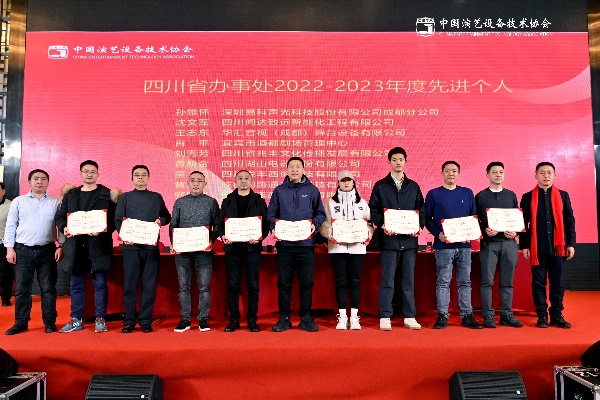 为2023年度优秀合作伙伴单位颁发证书,他们是广东擎田灯光科技有限公司、四川锐丰西蜀科技有限公司 、深圳易科声光科技股份有限公司成都分公司 、上海纳雅智能科技有限公司 、广州迪杰帕尔电子科技有限公司 、宁波金熠光电科技有限公司 、深圳杰力赛照明电器有限公司 、成都百实安科技有限公司 、成都利路通光电科技有限公司 、成都建汇声学科技有限公司 、四川景宏天文化传播有限公司 、广州祥明舞台灯光设备有限公司 、北京翰博尔信息技术股份有限公司 、广州市领先视听科技有限公司 、四川旭日辰龙文化传媒有限公司 、广东[伊仨]鼎峰电子科技有限公司。